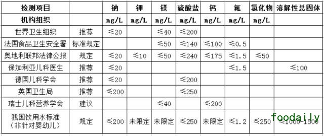 2003年,世界卫生组织WHO公开发表 《饮用水中的营养矿物质:对婴幼儿营养的影响》,提出了适合婴幼儿的饮用水中:钠≤20mg/L,硫酸盐≤200mg/L。无独有偶,法国食品卫生安全署、瑞士儿科学会、奥地利联邦法律公报、英国卫生局等机构也都对适合婴幼儿的饮用水中的矿物盐含量提出了要求。如下面所列举: