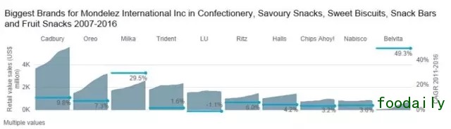 Euromonitor还指出,奥利奥目前的销售额有16亿,与亿滋主要的巧克力产品相当。