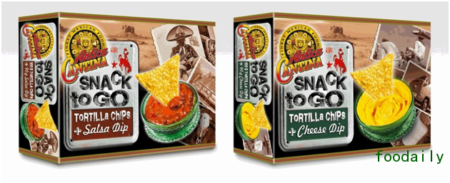 另外一个方便携带的零食是蘸酱薯片,包装规格为100 g,包括墨西哥玉米片及洋葱辣酱或芝士酱包。
