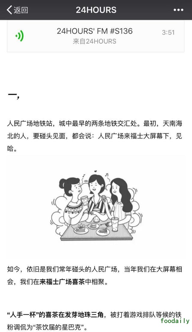 在各类媒体公众号中如24HOURS、Voicer、咖门等餐饮界和生活方式类公众号里都能看到与喜茶相关的定制内容,而从喜茶登陆上海前,就开始进行预热暖场,展现了喜茶在珠三角引起的风潮,扩大品牌知名度,其在上海中心地带人民广场来福士排的长龙更是成为了媒体与朋友圈围观议论的新风景线。