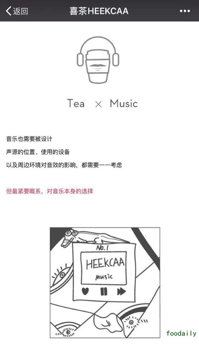 此外,喜茶服务号行文格调、配图画风,也与品牌的整体气质、门店风格相适配,清新、文艺,带有年轻人的随性。在服务号中,喜茶还加入了“喜茶Music”栏目,定期推荐与品牌气质相配的歌单,分享音乐、多方面参与消费者生活的同时,也凸显了品牌调性。