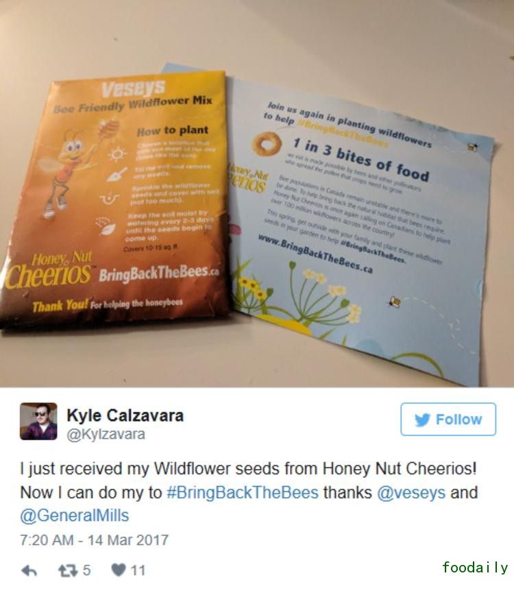 他们还做了一篇文章《你需要知道的 5 件事》来论述蜂的重要性,比如授粉昆虫能帮助作物完成生长、没有了蜂人类的食品多样性会遭到打击。排在第一位的内容是“我们通用磨坊要免费发放 1 亿粒野花种子给大家”。