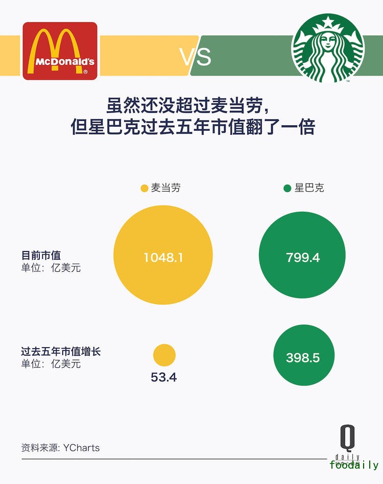 也就是说,星巴克将会超越麦当劳,成为全球最大的连锁餐饮公司。如果都按照现在我们认知意义上的星巴克、麦当劳来算,这个时间不到 40 年。
