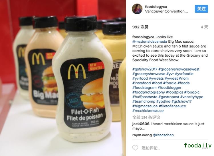 这周,加拿大美食博主 Diana Chan 去参加展会 Grocery & Specialty Food West Convention 的时候,在卡夫亨氏的摊位上发现了画着麦当劳 logo 和他们的经典汉堡的酱汁:
