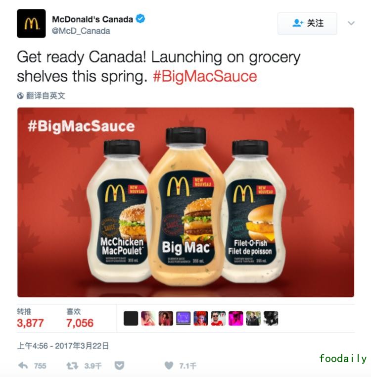 同一天,加拿大麦当劳的推特宣布,今年春天,麦当劳将会开始在杂货店卖他们的三种汉堡酱汁:巨无霸、麦香鸡和麦香鱼酱汁。在消息宣布之后,推特上不少人都表示了他们的兴奋。