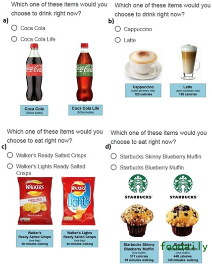 他们展示了458名五种不同食物类型(早餐棒、咖啡松饼、饼干、巧克力棒和薯片)和五种不同饮料类型(可乐、运动饮料、奶昔、咖啡和果汁)参与者的的图片。对于每种食品或饮料类型,每个个体以较高和较低卡路里的版本呈现,并具有匹配类型和品牌的选项,以确保品牌偏好不影响选择。