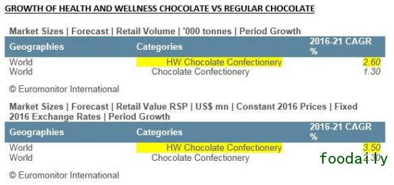 欧睿国际的数据显示,在2016年至2021年之间,保健与健康巧克力零售额的年增长率将达到2.6%,而同期传统巧克力糖果品类仅为1.3%。