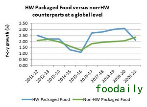 上述数据中还包括了整体的保健与健康包装食品品类的增长。从2017年年初开始,保健与健康包装食品的增长已经超过了传统食品,而这个趋势也将持续到2021年。