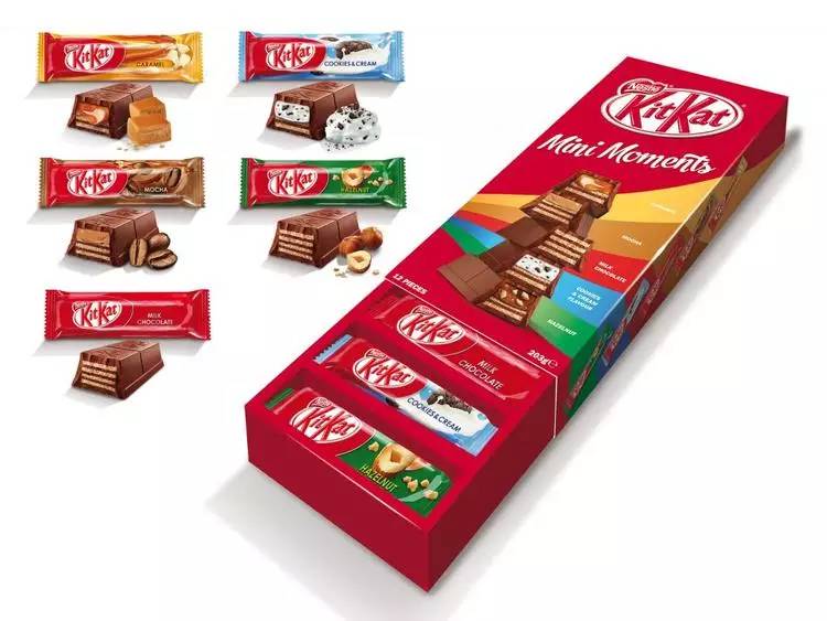 这和雀巢在今年1月在全球范围内推广的迷你Kit Kat目的是一致的,新版迷你Kit Kat有焦糖、摩卡、曲奇奶油、榛子和经典的牛奶巧克力口味,采用精品包装盒的形式,把这几种口味一并打包分类隔装,既可以拿来自己吃也可以赠送亲友。