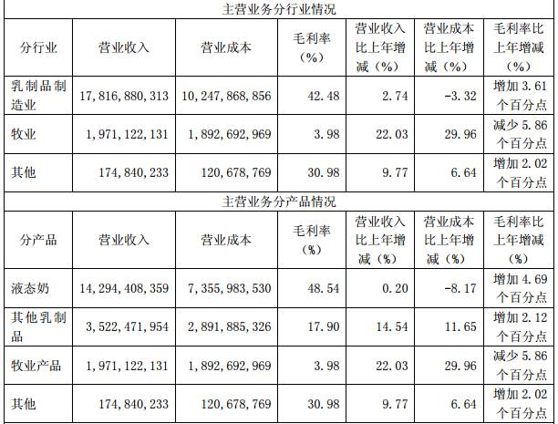 牧业实现营业收入19.71亿元,同比增长22.03%,主要原因是公司整合光明食品集团下属优质牧业资源,牧业板块规模不断壮大;营业成本为18.93亿元,同比增长29.96%;毛利率为3.98%,同比减少5.86个百分点,主要原因是原奶价格同比下降。