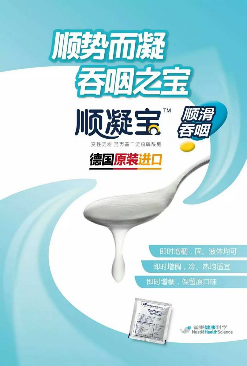 在一份通报中,雀巢表示,这次引进中国市场的“顺凝宝”是一种变形淀粉,专为吞咽障碍人群设计的医用食物增稠剂,随着添加剂量的不同,能够使液体形成类似糖浆、蛋羹或布丁的稠度。