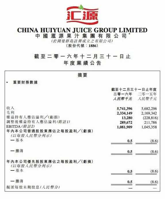 根据汇源的年报,2016年其收入为57.4亿元,而一年前为56.82亿元;期内赚1328万元。分产品看,合共贡献了近六成收入的百分百果汁和中浓度果蔬汁均实现不同程度的增长。