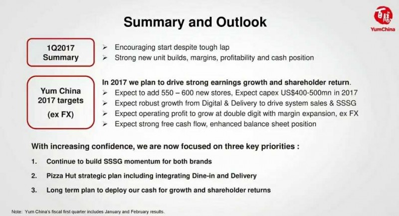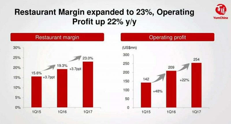 “我们很高兴公司的两大主力品牌,即肯德基和必胜客,都取得了同店销售增长。我们门店和销售增长的同时,也大大提高了利润率、盈利能力和现金状况。”潘伟奇说,一季度餐厅利润率增长至23%,这是近三年来的最高水平,主要得益于“营改增”的政策。