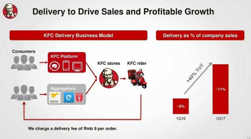 截至一季度末,百胜中国共有7600家门店,其中4400家提供外卖服务。一季度,肯德基的外卖业务增长了40%以上,约占其销售额的12%。屈翠容称,肯德基既拥有自己的网络订餐平台,也入驻了各大第三方外卖送餐平台。