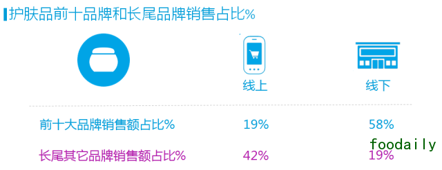 相较于线下,线上品牌分布更为离散,使小众品牌或新品牌有更大发展空间。护肤品类前十大品牌的线上线下占有率分别为两成和六成即为力证之一。再以护肤品中的精华为例,其线上线下市占率分别为三成和两成。可见高端护肤品在线上更受欢迎。
