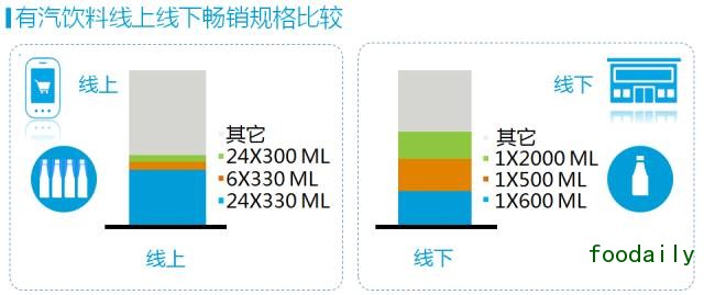 除了产品差异化,线上线下不同的包装规格战略也至关重要。以汽水为例,线上最畅销的是家庭装,在线下则是偏向单品的。这意味着线上线下不同的消费场景促生了不同的消费目标和需求。