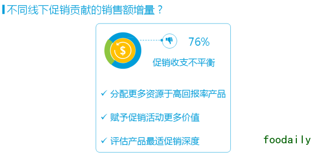 再说线下促销。在2016年所有大卖场的促销中有76%是亏本的。可见要提高店内促销投资效率,务必评估促销组合的有效性,找到最高效方案。以洗发水为例,对折、第二件半价、买一送一三种促销方法的回报率各不相同,其中对折最为高效。虽然对于消费者来说,后两种的消费相同,但由于其对不同方案的接受程度不同,就会产生不同的投资回报率。