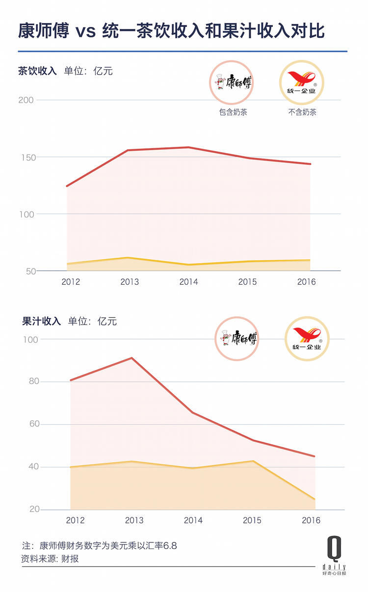 不过 2016 年,对于统一和康师傅来说都是比较艰难的一年。统一收入为 209 亿元人民币,同比下降了 5.1%;体量更大的康师傅收入为 83 亿美元(约 576.8亿元人民币),但下滑幅度更大,为 8%。
