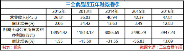 4月20日,三全食品发布2016年年度报告,2016年营业收入为47.8亿元,同比增长12.83%,归属上市公司股东的净利润为3947万元,同比增长13.09%。