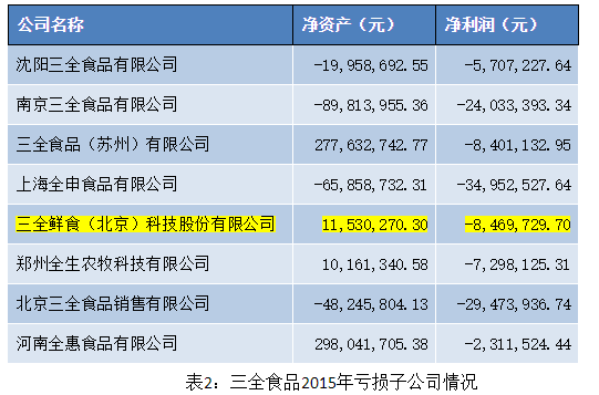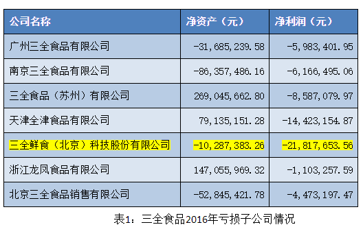 比较三全食品2015年、2016年两年年报的子公司数据可以看出,三全食品旗下部分子公司处于亏损状态,其中南京三全食品有限公司、三全食品(苏州)有限公司、三全鲜食(北京)科技有限公司、北京三全食品销售有限公司处于连续亏损状态。其中被寄予厚望的“三全鲜食”在2016年亏损由2015年的846.97万扩大至2016年2181.77万元。