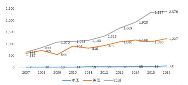 图1. 2007年-2016年中国、美国和欧洲每年上市产品宣称有“全麦”的产品数量统计(单位:个)