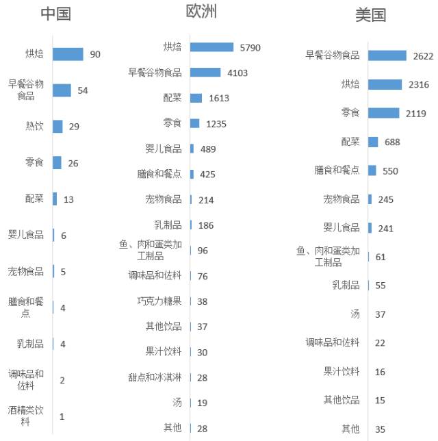 图2. 2007年-2016年中国、欧洲和美国上市的产品中含有“全麦”宣称的食品品类与数量统计(单位:个)