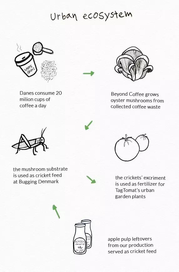 Bioark公司帮助Insekt KBH公司开发出了一套可持续的食物循环运行模式,这个循环链条中包含咖啡、蘑菇、西红柿和蟋蟀。