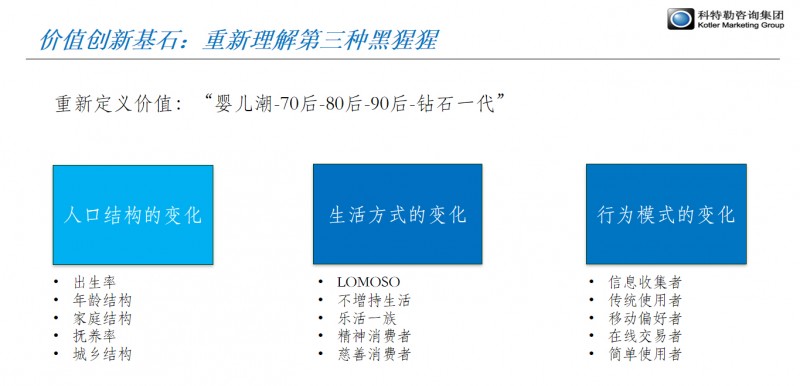 对于营销人员来说,是否深入了解这样的新阶层、新市场、新消费者,决定了能否进行真正的创新。开发新的产品,设计新的包装,应用新的技术,这些只是创新的手段。真正的创新是源自于对顾客深入的了解,看到了竞争对手所看不到的市场定义,重新定义细分消费者的价值。