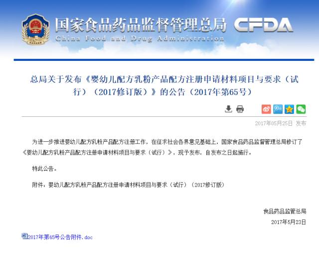 就在刚刚,国家食品药品监督管理总局官网发布关于发布《婴幼儿配方乳粉产品配方注册申请材料项目与要求(试行)(2017修订版)》的公告(2017年第65号),这有望为企业的配方注册“提速”。