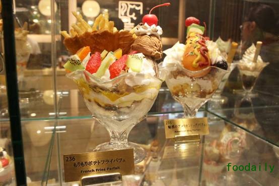 除了传统的圣代,「からふね屋」还在此基础上进行了大胆的创新,创意地将冰淇淋和油炸食品结合到一起,挑战人们的味蕾。