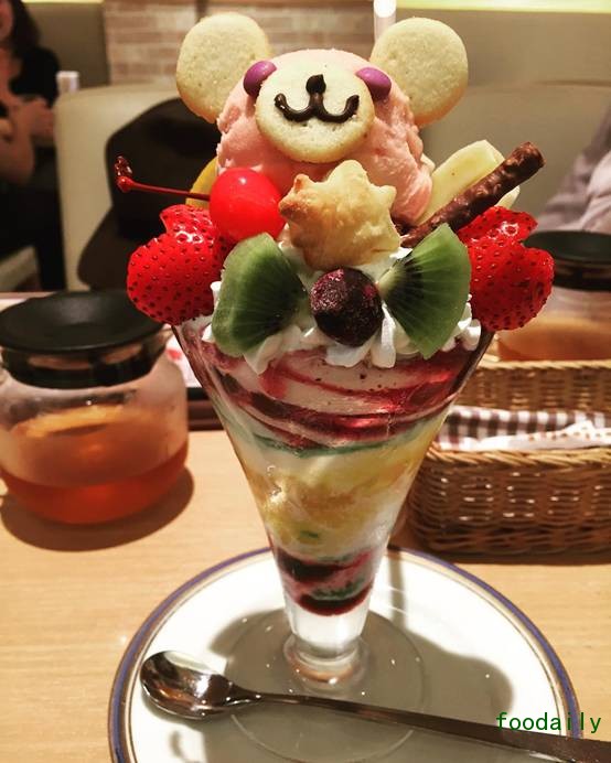 「くまアイスの虹色パフェ」可爱熊的造型,彩虹般的色泽。迷人的身姿让这款甜品大受欢迎。