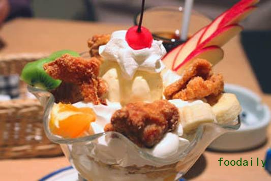 「からあげパフェ」炸鸡圣代,金黄的炸鸡与甜美冰淇淋的绝配。