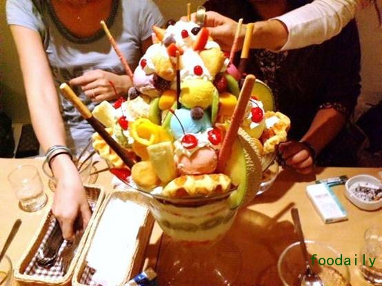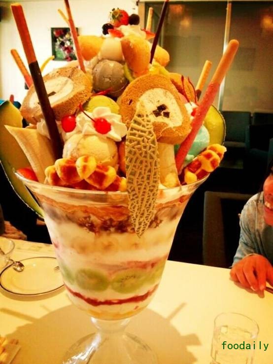 堆积了18种冰淇淋,插满了Pocky棒,豪爽地堆上哈密瓜,还有猕猴桃,香蕉和鲜奶油……整个圣代处于满满当当的饱和状态。因为巨大圣代制作起来需要更多时间,因此想要品尝需要提前预约。