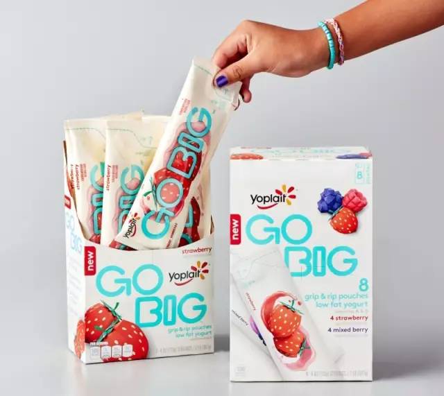 Yoplait 针对青少年和儿童推出的Yoplait Go Big便携式条装酸奶,非常便于持握和打开,单手挤压就可以食用,每袋有4盎司,足以满足大孩子的胃口。