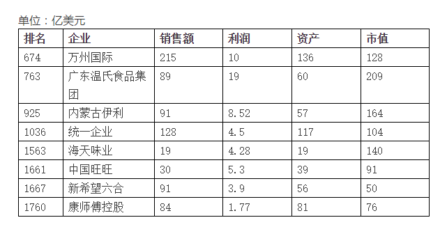 此外,大家熟悉的统一、海天、旺旺、康师傅等食品企业也进入了全球企业2000强。