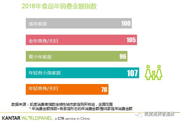 凯度消费者指数连续性城市家庭购买样组研究显示,年轻有小孩家庭在2016年对食品的年消费金额已近市场水平的1.1倍,在五类家庭形态中当属最高。因此,不少食品厂商纷纷将目光瞄准了儿童市场,致力于打造出专属于儿童、风格鲜明的产品。除了在传统的牛奶,酸奶以及饮用水等品类积极推出儿童专用产品外,一些新兴的品类更是抓住奶爸奶妈最为注重的“安心“与”健康“的概念在儿童市场做大做强,其中在2016年凭借健康属性保持快速增长的奶酪和保健滋补品市场,年轻有小孩家庭的消费更是脱颖而出,两个品类的销额占比分别达到43%和32%,可见为小朋友的健康成长各路家长也是操碎了心!