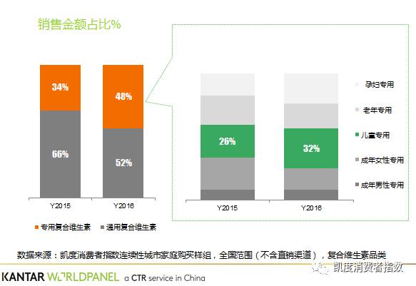 目前在此领域表现活跃的当属复合维生素:在通用的普通维生素基础上,针对某一特定人群推出的定制化产品在2016年表现亮眼。相较于普通维生素的负向增长,专用复合维生素则以48%的销额增速全面带动整体品类的发展,儿童专用产品的表现更是遥遥领先。