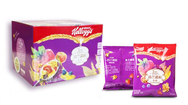 家乐氏Kellogg’s水果麦片在麦片品类中的品牌知名度不算低,采用比利时进口谷物,燕麦、小麦、玉米、大米四种谷物搭配香蕉、葡萄、黄桃、草莓、苹果五种水果,采用冻干技术锁鲜多重营养。产品包装上家乐氏采用小包随身携带装,专为年轻人定制。