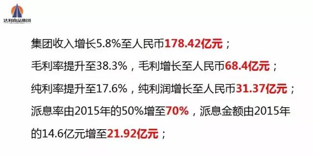 2017年3月23日,达利食品集团公布2016年业绩,公司收益同比增长5.8%至178.42亿元;毛利同比增长17.6%至68.4亿元;净利润同比增长7.7%至31.37亿元;每股盈利0.23元。