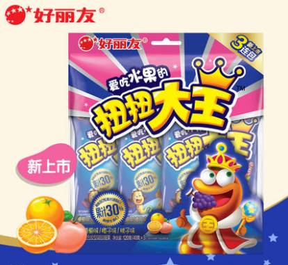 产品简介:近期,好丽友品牌推出了旗下第一款水果软糖——扭扭大王水果软糖。该款果汁软糖混合三种3种水果口味,有孩子们最喜欢的葡萄、橙子和桃子味。在产品制作的过程中添加了30%的果汁,及VC,味道酸酸甜甜,果味纯正浓郁。