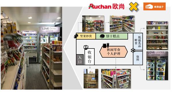 6月9日,继欧尚之后,高鑫零售旗下大润发首个缤果盒子也正式在上海大润发总部楼下亮相,门店规格是6m*2.6m,经营面积15.6平方米,主营适合办公人群的便利性快消品。