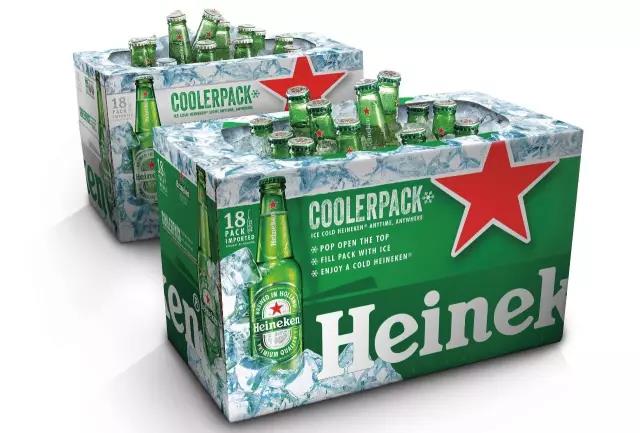 前不久,喜力啤酒推出了一款创新纸箱包装——COOLERPACK,消费者只要拿掉纸箱的盖头,加入冰块,装满18瓶啤酒的纸箱就能一秒变成冰桶了。