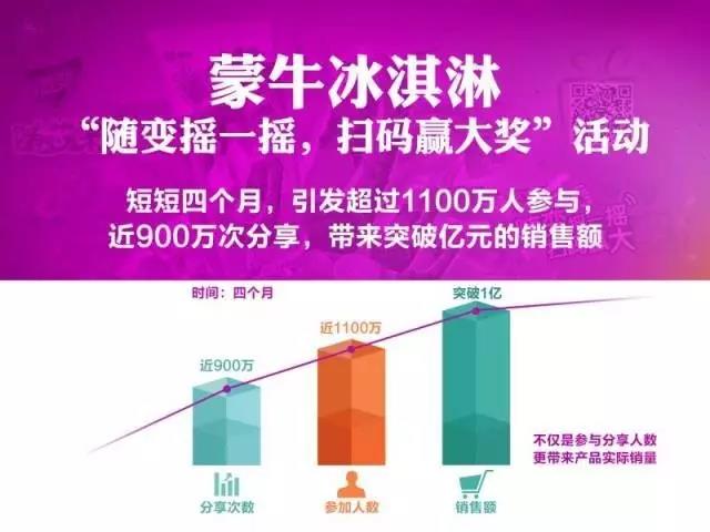 1个平台即蒙牛冰淇淋基于微信端开发的 “随变摇一摇,扫码赢大奖”活动H5页面,创新推出先摇奖、后购买产品的“零门槛”营销模式,消费者只需扫描蒙牛冰淇淋活动二维码,进入活动H5页面后摇摇手机,即可免费参与这场100%中奖的全民狂欢。让每一位参与的消费者摇到欲罢不能。完美实现营销活动病毒式自传播与线下销售转化相结合。