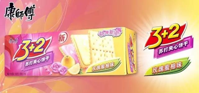 康师傅糕饼上市主打的是品类是夹心饼干,它的主要口味是来自夹心中的馅,当时市面上的所有的夹心饼干都是两片饼干夹一层馅。针对这些竞争对手的状况,康师傅率先推出其主打产品“3+2”奶油苏打夹心,独创3片饼干夹2块奶油馅的产品,并给其取名为“3+2”,意为“3夹2”。