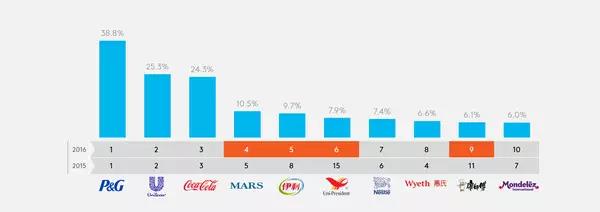 制造商方面,宝洁、联合利华、可口可乐以绝对优势占据了前三甲,剩下的七个名次略有变化,值得注意的是,更多的中国本土品牌进入了榜单。