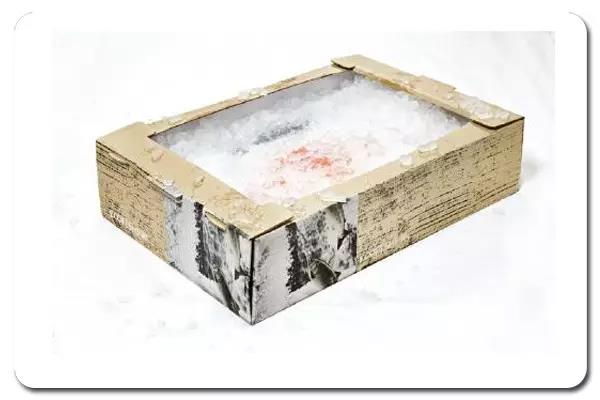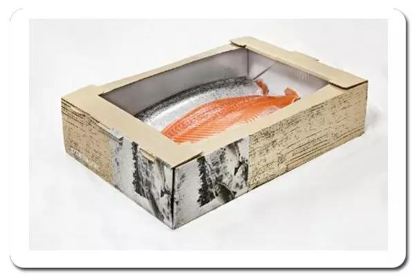 这是一款基于可再生材料(瓦楞纸板)的防水、防漏包装概念,用于包装鱼类产品。包装两侧的衬垫有防潮层。用这种材料可取代EPS并且可回收、可持续。运输和存储过程中节省空间,可以折成扁平纸板递送,具有很好的印刷可能性,看起来更高端,可以给产品增值。
