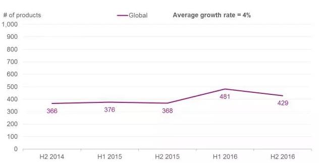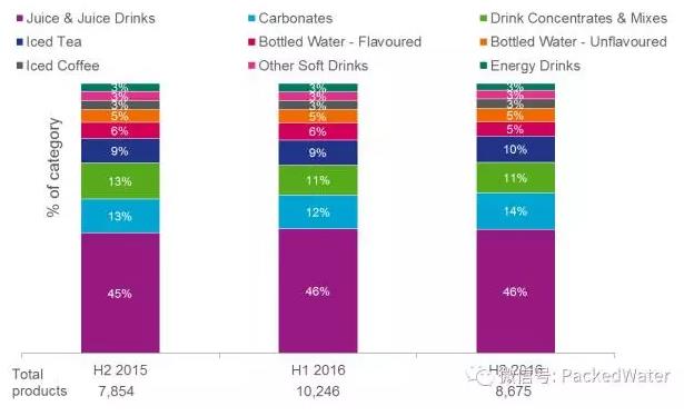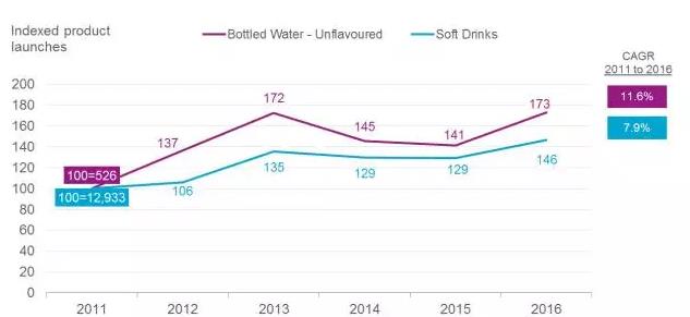 在2014下半年到2016下半年期间,通过跟踪全球瓶装水产品发布,2016上半年发布的产品增长达到峰值为31%。