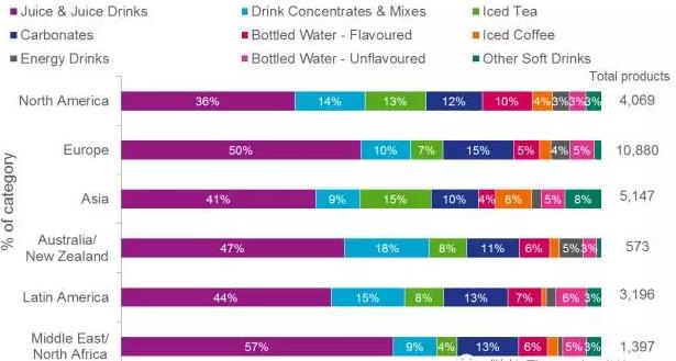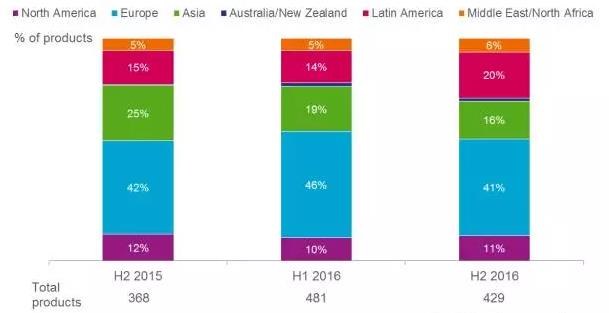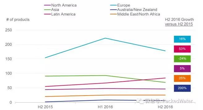 在过去三个半年,对全球范围的瓶装水发布跟踪发现,欧洲所发布的产品平均占到43%,在2016下半年,拉丁美洲取代了亚洲,成为发布产品排名第二的地区。