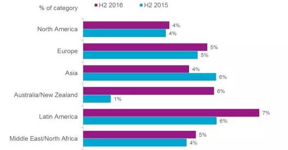除了亚洲,其它区域均是呈现增长的趋势,其中澳大利亚与新西兰是增长最快的区域。