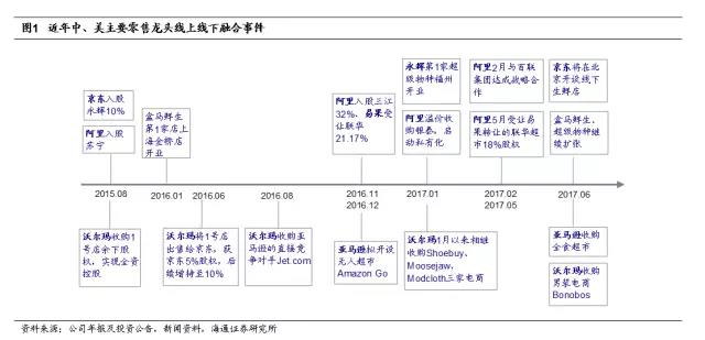 除了美国的亚马逊之外,国内的阿里巴巴、京东也早早开始了线下布局,协同互联网思维与技术以及线下的供应链、体验等优势回归商品与服务的零售本质,尤其是在2016年10月马云提出新零售概念之后,阿里的布局明显提速,加快推动零售产业变革。其中:阿里巴巴先后入股了苏宁、三江、联华超市等,并私有化银泰和与百联签署合作协议;京东则入股了永辉,并借收购一号店与沃尔玛展开合作。